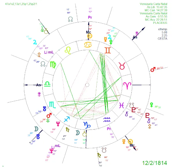 - Júpiter en Cáncer sobre Sol natal de Venezuela (MC) en oposición a Plutón en tránsito con Venus en Capricornio (Fondo del cielo): conflicto entre expansión de identidad nacional, memoria histórica y crisis profunda de estructuras de poder (Plutón) con tensiones económicas y de seguridad.